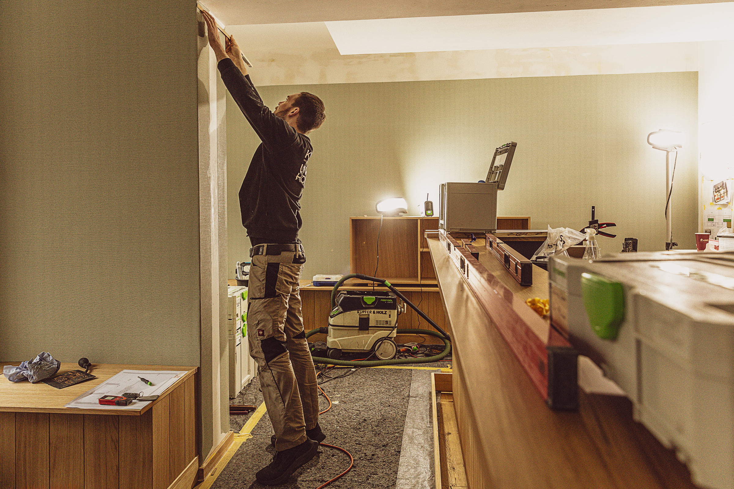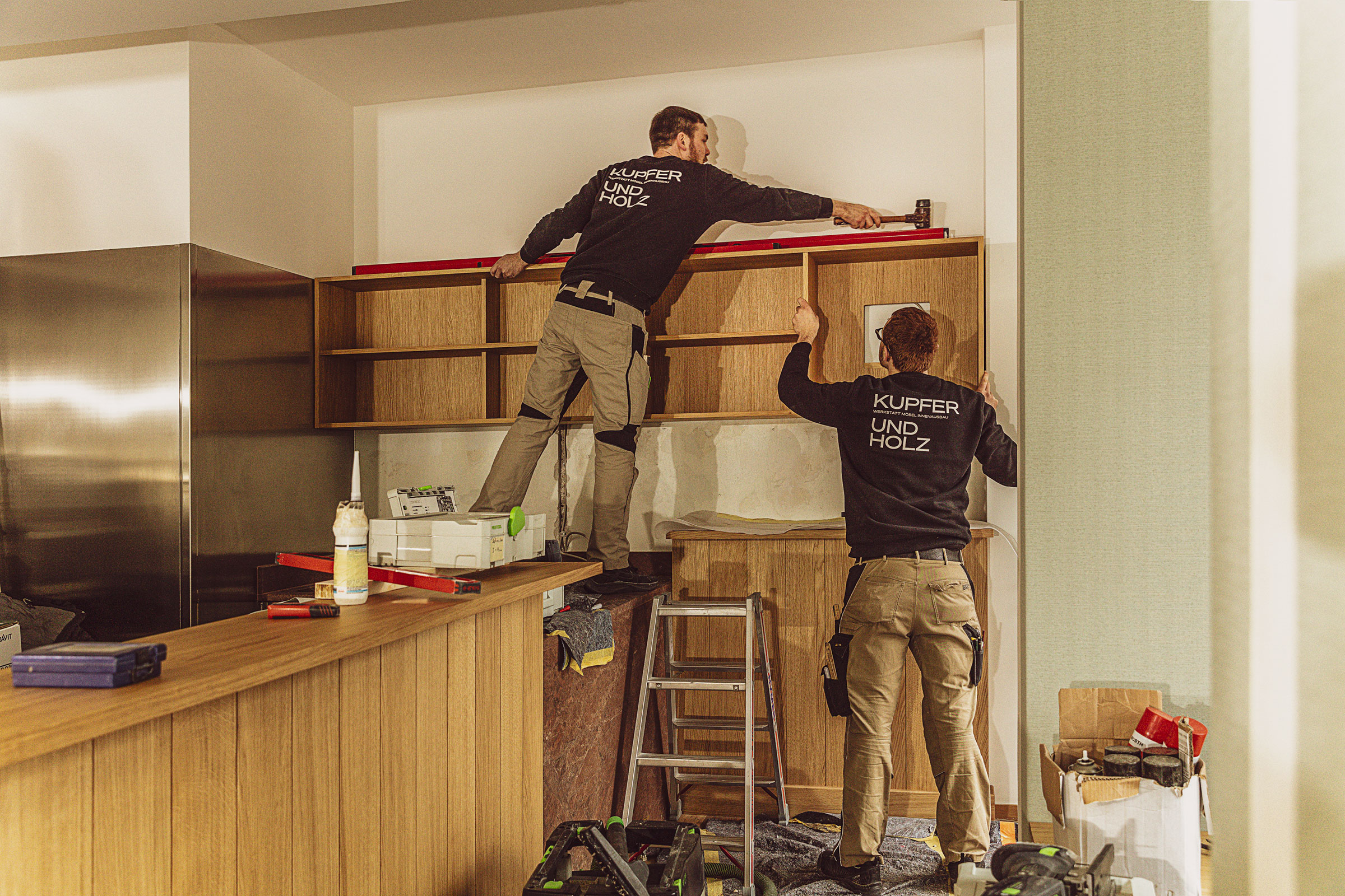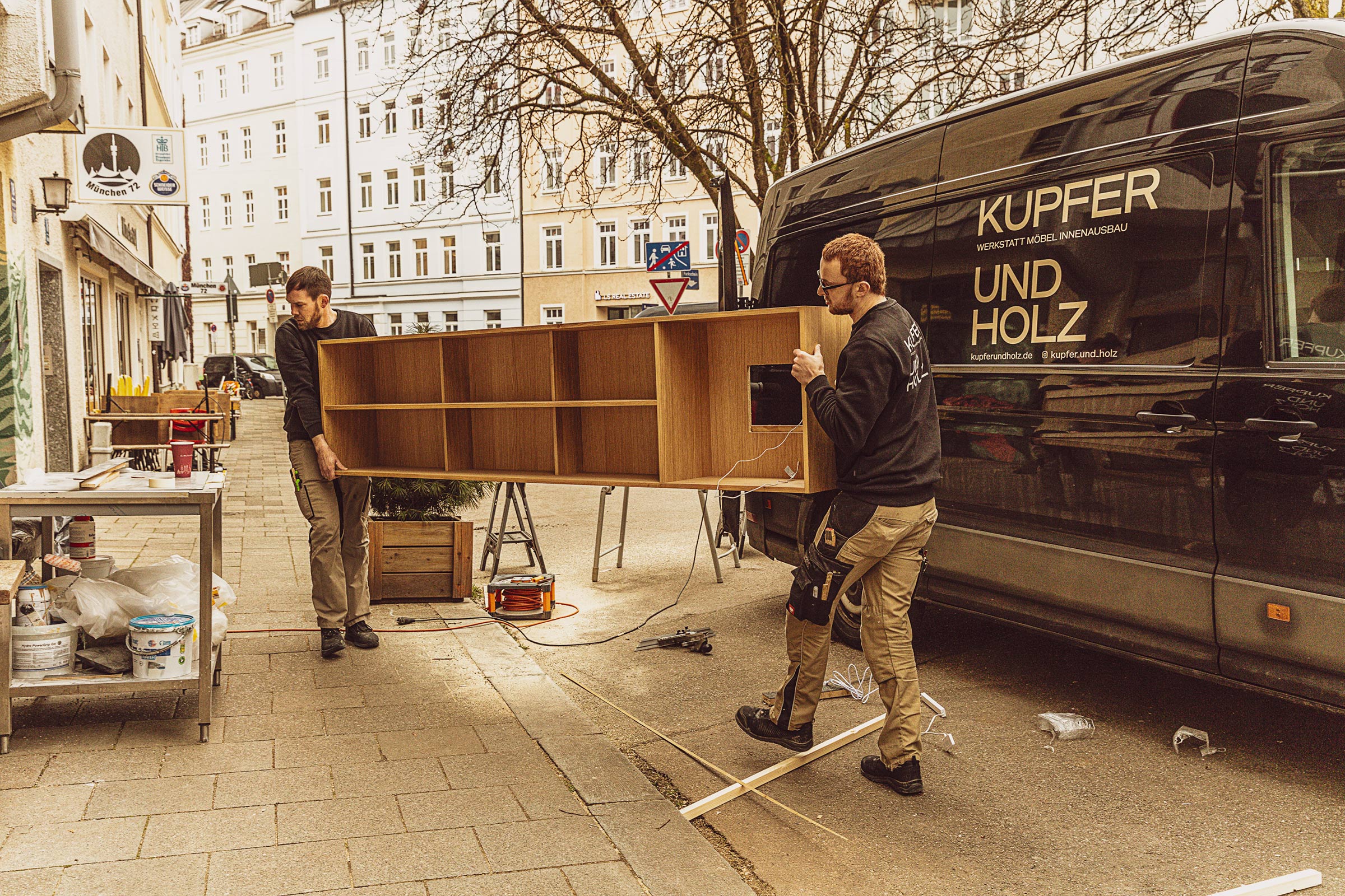 Kupfer und Holz erstellt individuelle Innenausbaukonzepte. Ich fotografierte eine Fotodokumentation über die Arbeiten für das Café Carlotta in München.
